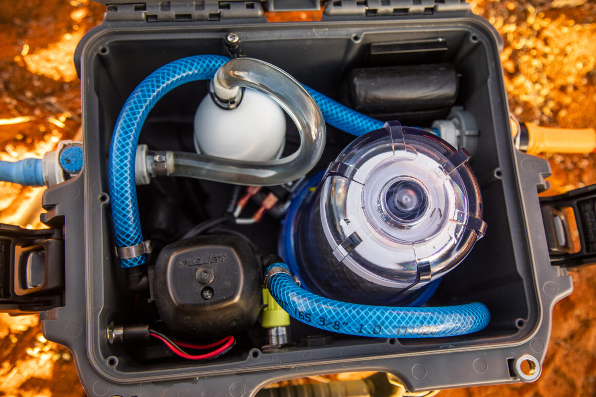 To address the challenges of water filtration on our trip we got to work researching portable water filtration systems. We couldn’t feasibly stay parked in the one spot for days on end so needed a solution that could re-fill a water tank and keep us moving. After looking at a few different options we ultimately landed on a little unit called the Guzzle H20 Stream from Off Grid Adventure Co. Designed for filtering and purifying water on the go, the Stream is a compact little number with a rechargeable battery that promises to be able to fill a jerry can with safe drinking water while you peg out your swag.