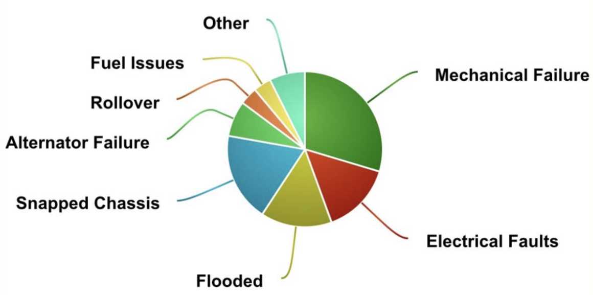 After a big 2024 recovery season, the team pulled together a pie chart of all the callouts they attended. It’s not just anecdotal, this is what broke down, blew up, or rolled over in the Simpson last year.